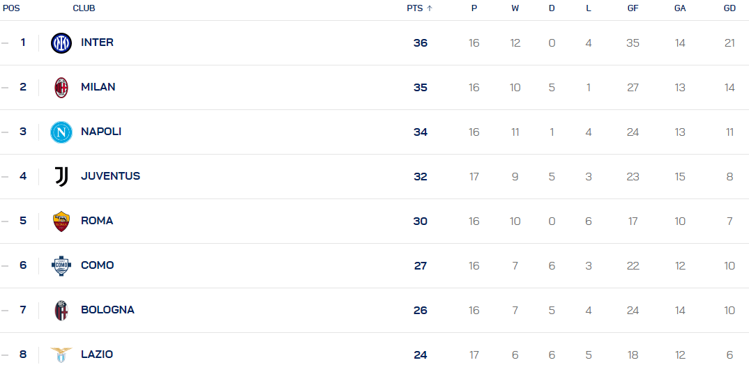 北京时间12月29日,意甲第17轮基本战罢,仅剩罗马VS热那亚一场,积分榜情况如下: